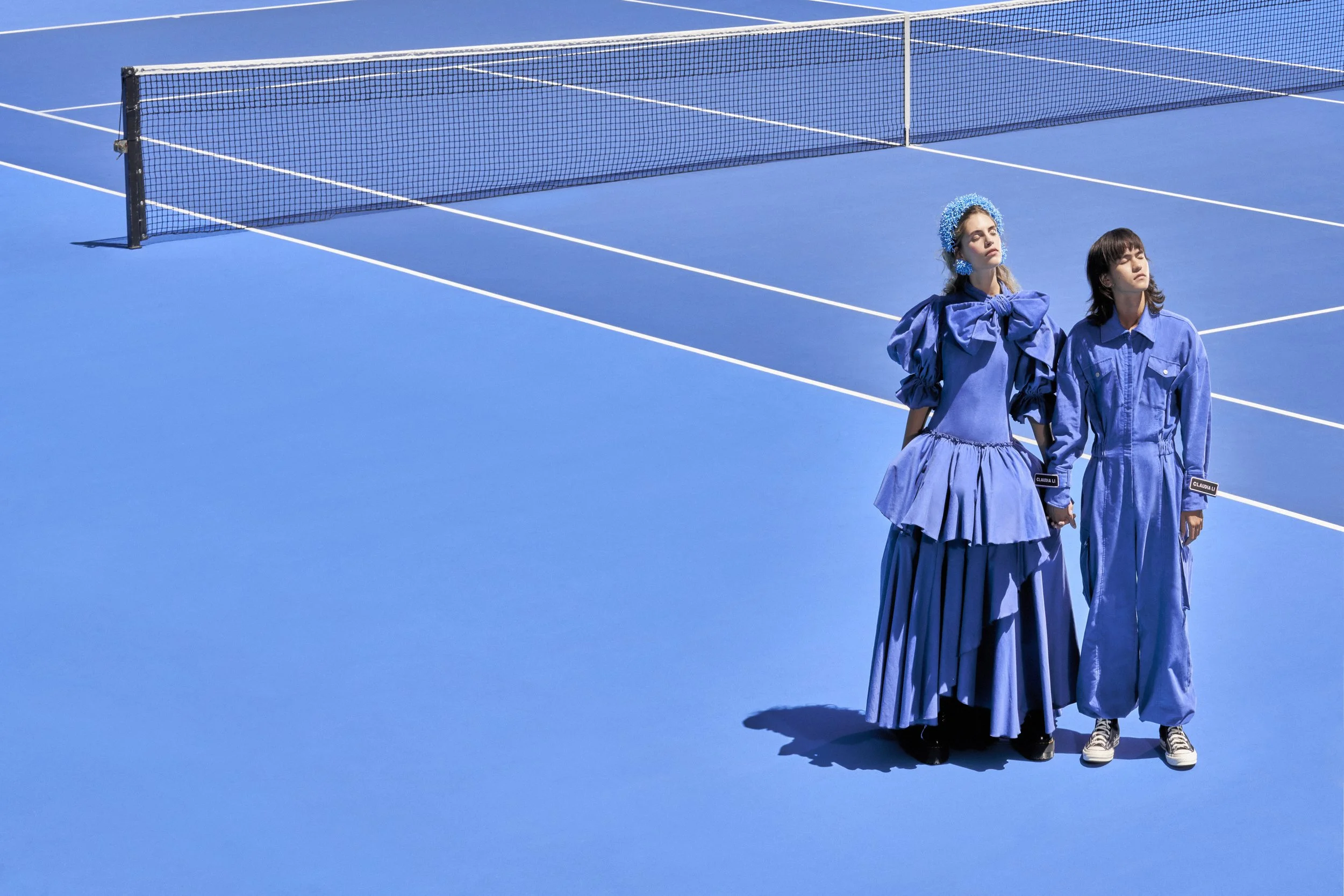 Claudia Li’s Autumn/Winter campaign was shot on the cobalt blue courts of the ASB Tennis Centre in Tāmaki Makaurau, Aotearoa. Her designs' bold colours and intricate patterns stood out sharply against the vivid backdrop, creating a striking interplay of form and vibrancy. The graphic lines of the tennis court amplified the collection’s dynamic energy, offering a modern, polished contrast that elevated each look. This was a campaign defined by boldness and precision, where every element worked in harmony to bring Li’s vision to life.